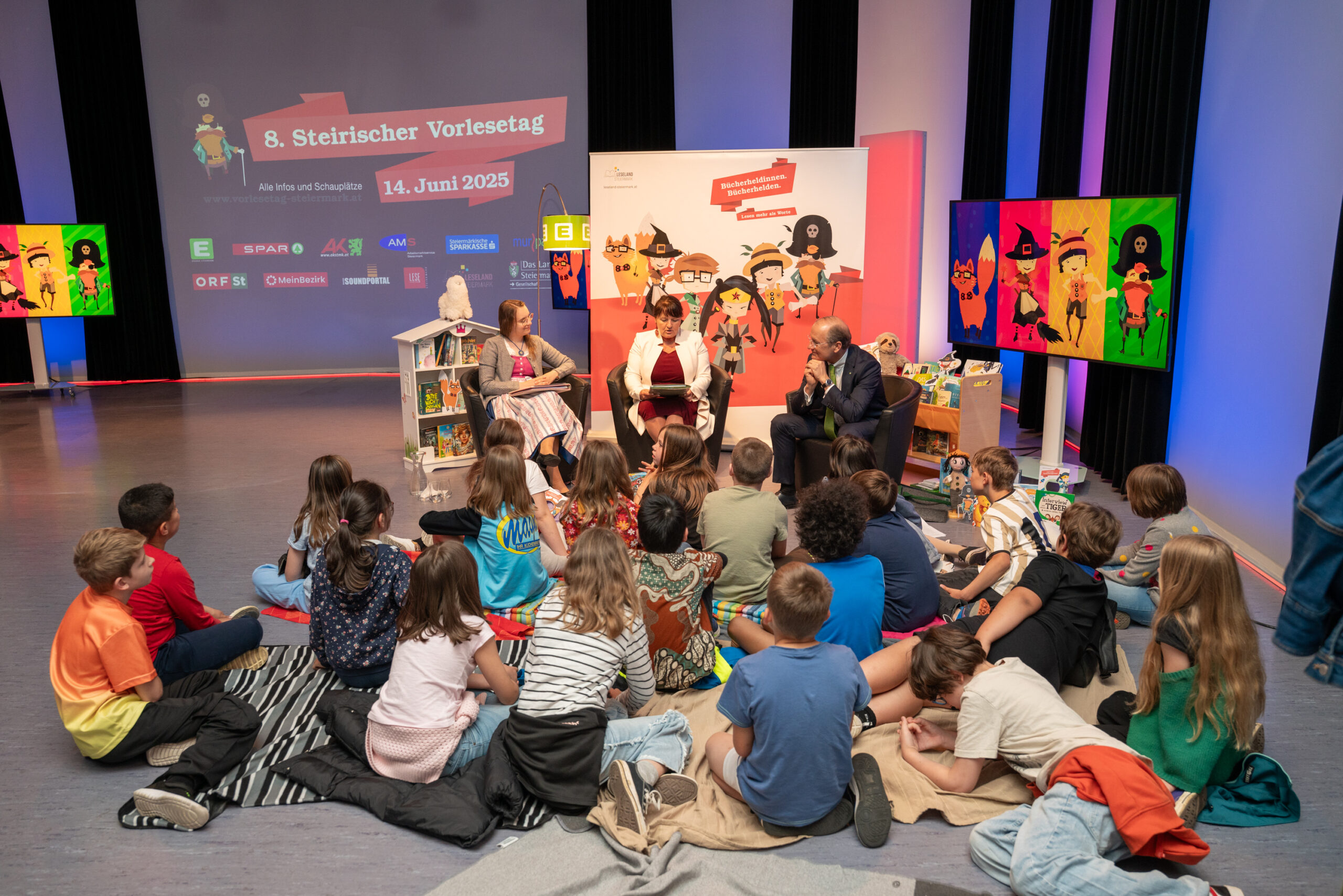 Im Anschluss an die Pressekonferenz stürmten drei Schulklassen das ORF-Landesstudio in Graz und ließen sich von Landeshauptmann-Stellvertreterin Manuela Khom und den Sponsorinnen und Sponsoren in drei ORF-Studios vorlesen. Die Geschichten stammten aus dem Geschichtenwettbewerb 2025, einer weiteren Initiative von Leseland Steiermark.