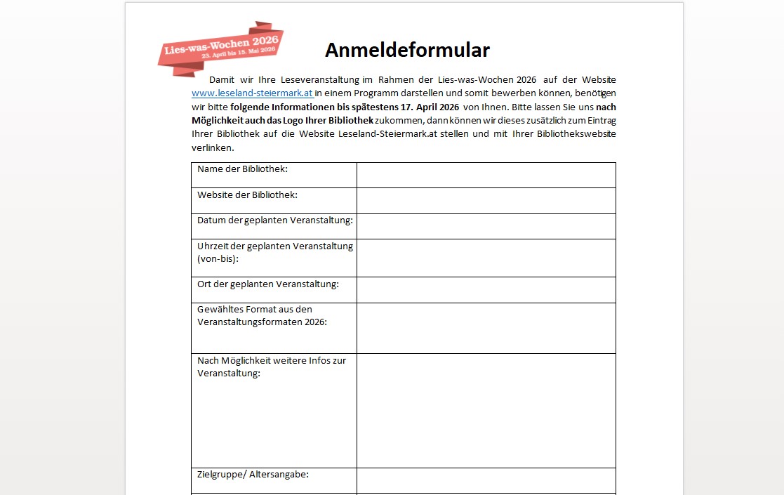 Nur wenn Ihre geplante Veranstaltung für die Lies-was-Wochen 2026 inkl. Veranstaltungsformat und Datum bis zum 17. April 2026 beim Lesezentrum anhand dieses Anmeldeformulars angemeldet und das Logo der Bibliothek übermittelt wurde, kann diese als besondere Fördervoraussetzung im Zuge der Landesförderung berücksichtigt werden.