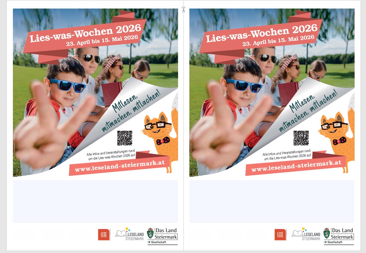Für die Bewerbung Ihrer Veranstaltung im Rahmen der Lies-was-Wochen 2026 stellen wir Ihnen Veranstaltungsflyer im A5-Format zum Download zur Verfügung. Auf einer A4-Seite befinden sich zwei Flyer. Diese sind editierbar, d.h. Sie können im markierten Bereich Ihre eigene Veranstaltung einfügen. Zusätzlich können Sie bis zu drei Logos in der unteren Logoleiste einfügen, indem sie auf den Platz neben den Logos klicken.