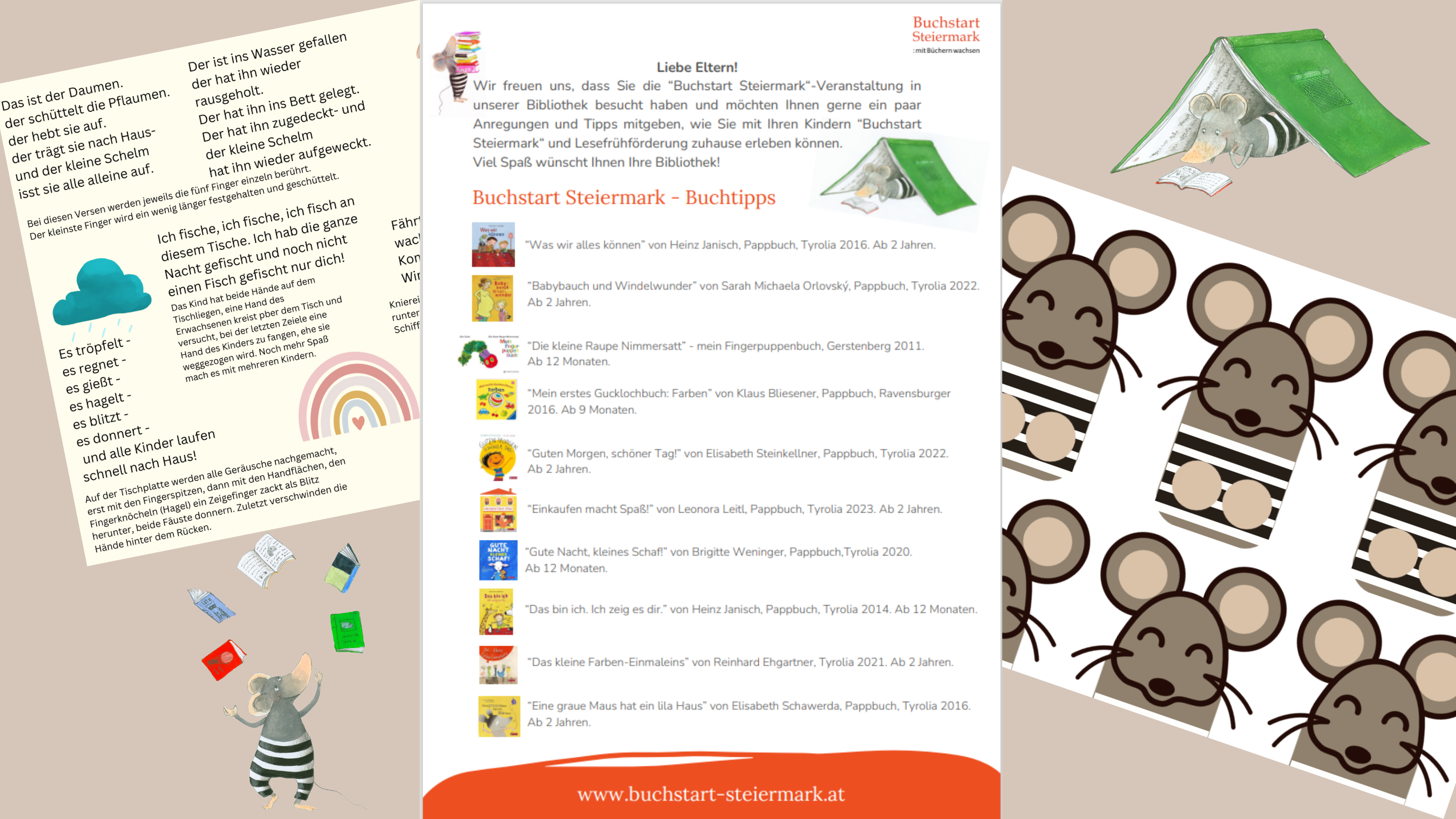 Sie können eine „Buchstart Steiermark“-Veranstaltung mit Ihrem Kind nicht besuchen, da es krank ist oder das Wetter draußen regnerisch und kalt? Hier finden Sie diverse Vorlagen und Tipps, wie Sie „Buchstart Steiermark“-Ideen auch zuhause umsetzen können. Schmökern Sie in der Liste mit den Büchertipps, Kniereitern und Liedern, erleben Sie mit ausgewählten Fingerspielen und Reimen lustige Momente mit Ihrem Kind und basteln Sie anhand der Vorlage eine Fingerpuppe einer Maus – Ihrer persönlichen Mio Maus!