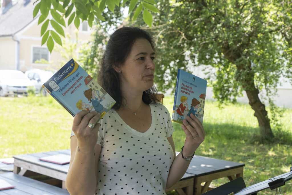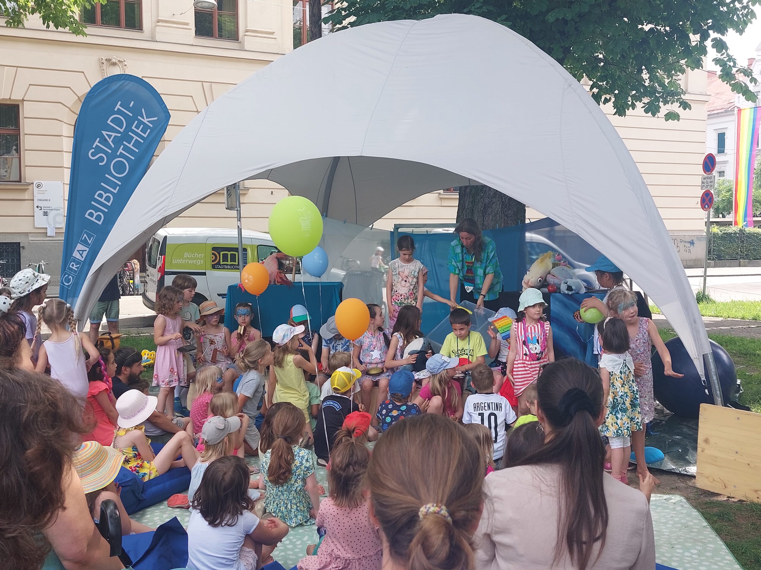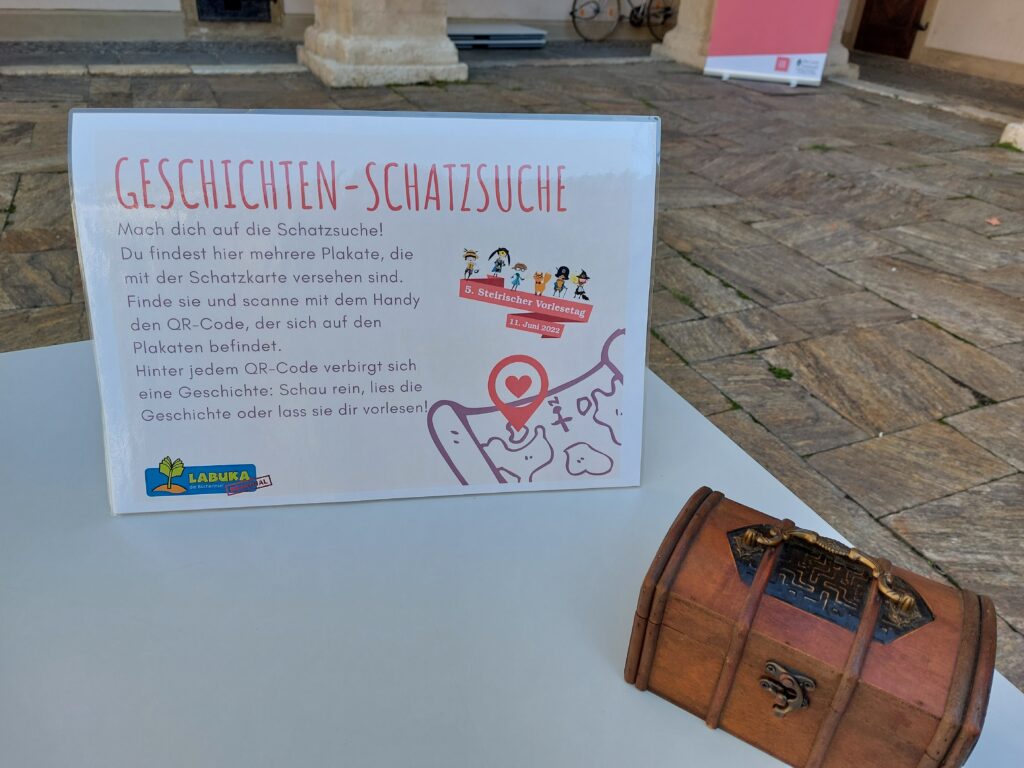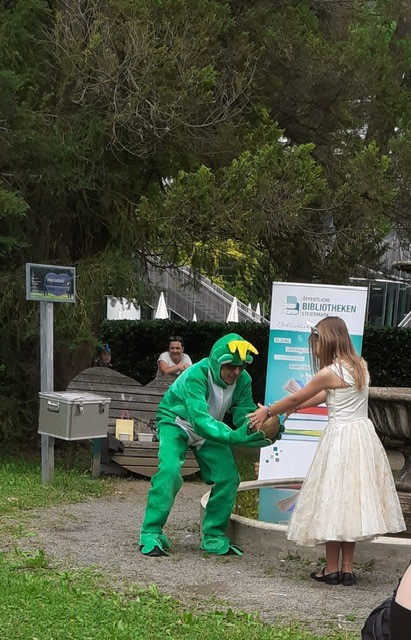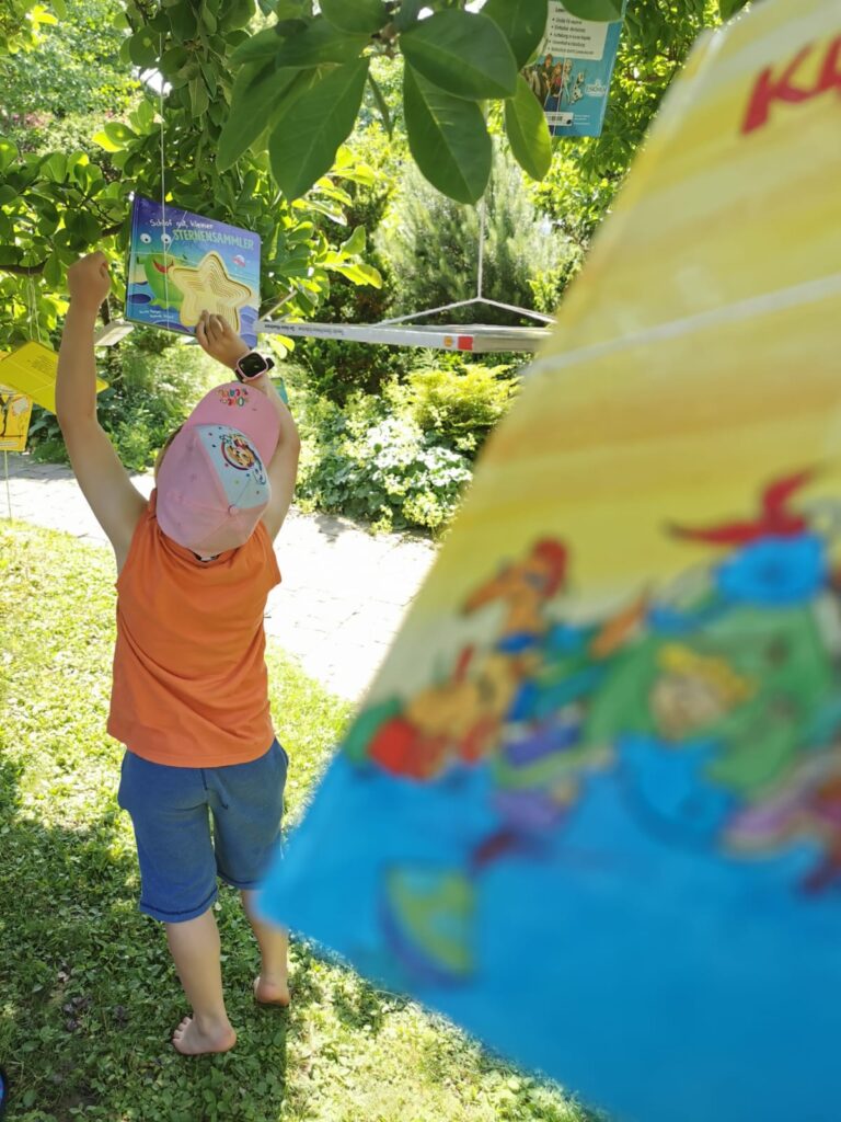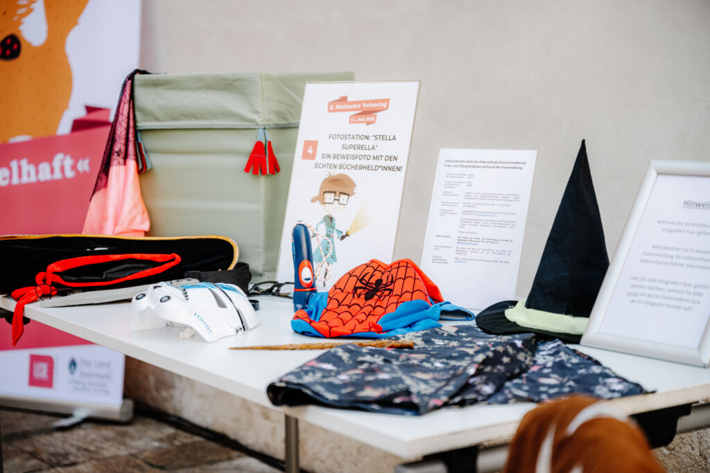 In dieses Veranstaltungsformat lassen sich sehr gut die sechs Bücherheld*innen Harald, Conny und Co. integrieren, sodass jede/r Bücherheld*in eine eigene Station bekommt wie beim 5. Steirischen Vorlesetag 2022 im Landhaushof in Graz.
