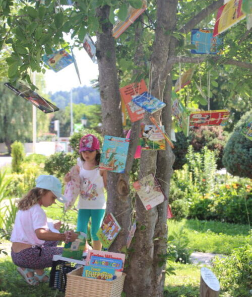 Bücher wachsen doch nicht auf Bäumen? Oh doch! Am Steirischen Vorlesetag können Bücher zum Mitnehmen auch auf einem Baum im Park hängen. So ein Bücherbaum erregt großes Interesse bei Klein aber auch Groß und stellt ein nettes Rahmenprogramm nach einer Lesung dar. Meistens handelt es sich bei den Buchgeschenken um Bücherspenden oder aussortierte Medien einer öffentlichen Bibliothek.