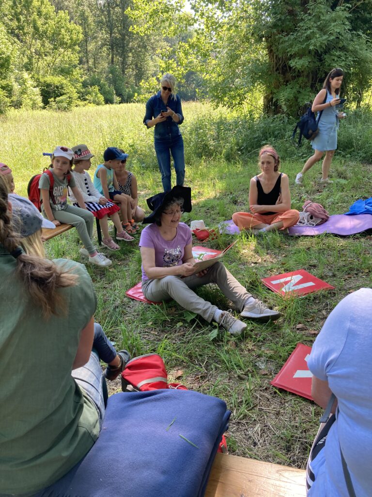 Bei einem gemütlichen Vorlesepicknick im Freien werden die Lieblingsgeschichten der Kinder in einem entspannten Rahmen vorgelesen. Jedes Kind kann entweder seine Lieblingsgeschichte mitbringen oder eine Geschichte aus einer bereitgestellten Bücherkiste auswählen.