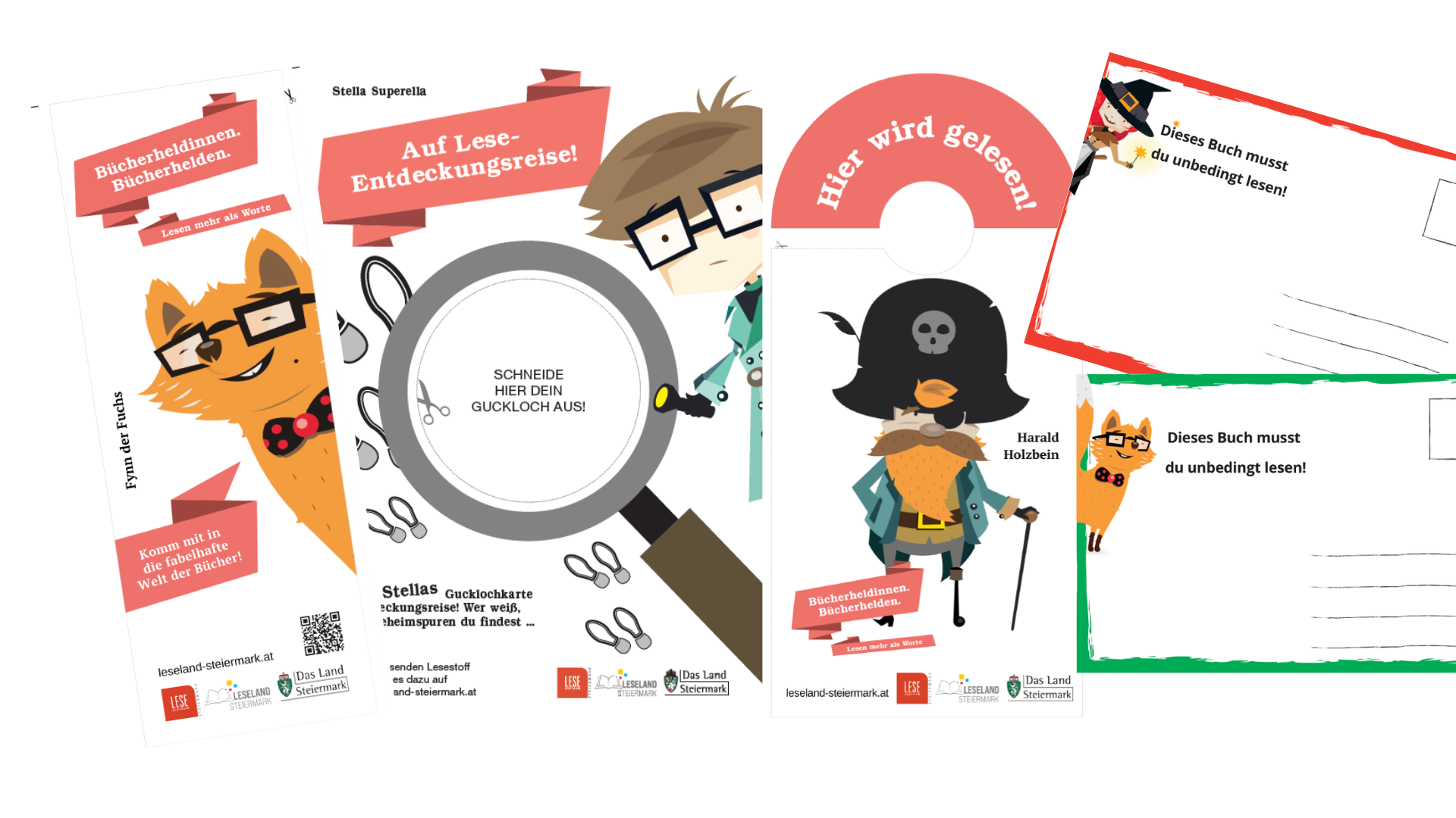 Falls Sie für Ihre Vorleseveranstaltung Lesezeichen, Gucklochkarten, Türhänger, Postkarten oder Ausmalblöcke zu den Bücherheld*innen benötigen, finden Sie diese und noch weiteres Material auf unserer Website unter den Downloads zur freien Verwendung.