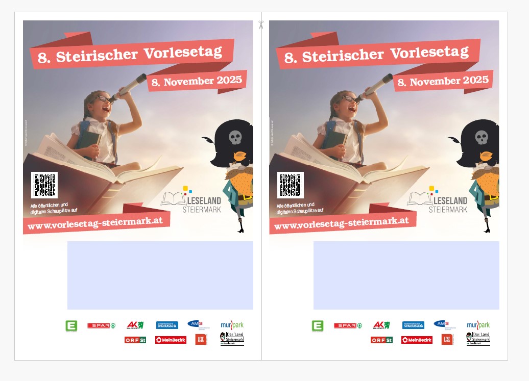 Zusätzlich zu den Plakaten steht Ihnen für Ihre Öffentlichkeitsarbeit auch ein Flyer im A5-Format zur Ankündigung Ihrer Vorleseveranstaltung unter den Downloads auf unserer Website zur Verfügung. Dieser A5-Flyer ist eine editierbare PDF-Datei, d.h. Sie können im markierten weißen Bereich Ihre eigene Veranstaltung einfügen. Zusätzlich können Sie noch zwei weitere Logos links vom Text platzieren, bevor Sie die PDF-Datei ausdrucken.