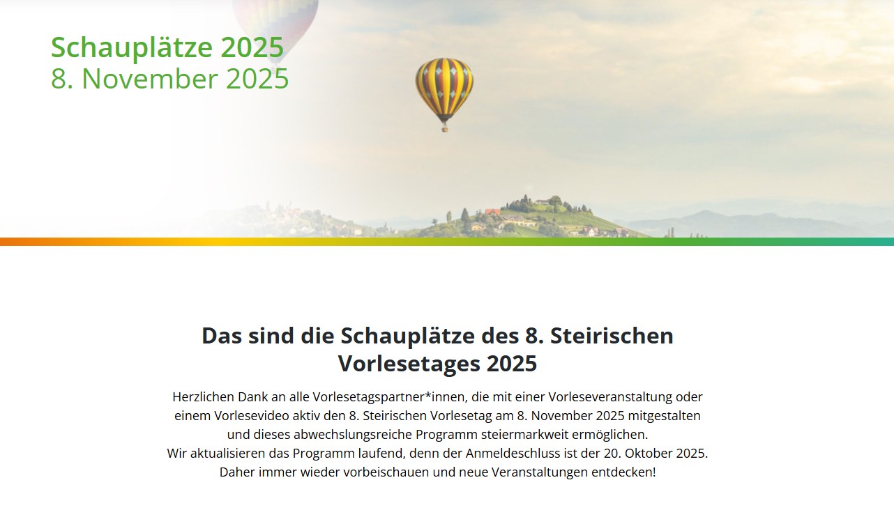 Das Programm zum 8. Steirischen Vorlesetag 2025 ist auf dieser Website unter den Schauplätzen 2025 zu finden. Auch Ihre angemeldete Veranstaltung scheint hier nach interner Kontrolle und Freischaltung in der jeweiligen Bildungsregion auf. Aus diesem Grund ist eine Anmeldung zum Steirischen Vorlesetag nur über unser Online-Anmeldeformular möglich. Bei der Anmeldung laden Sie bitte auch Ihr Logo hoch, das dann im Programm neben Ihrer angemeldeten Veranstaltung zu finden sein wird.